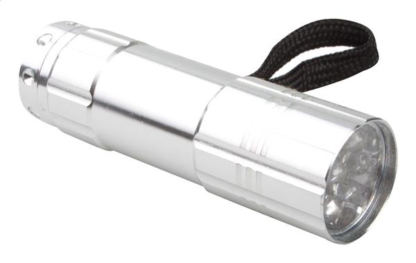 Aluminiowa latarka z 9 diodami z paskiem na dłoń. Description: Aluminiowa latarka z 9 diodami z paskiem na dłoń. Primary Color: srebrny Baterie w zestawie: Tak Material 1: Aluminium Rozmiar: o26×90 mm Ilość i typ baterii: 3×AAA