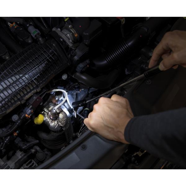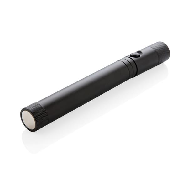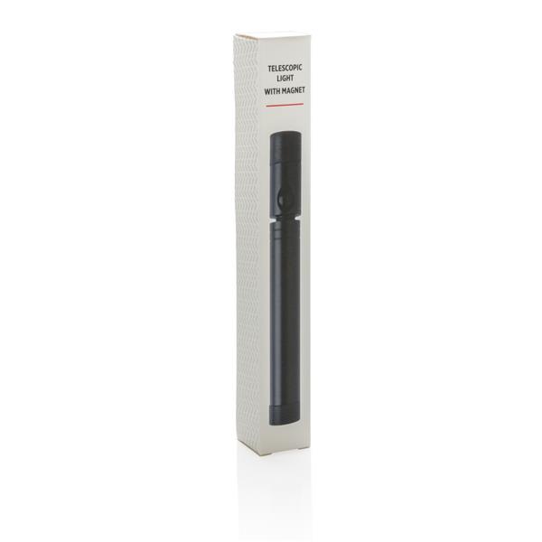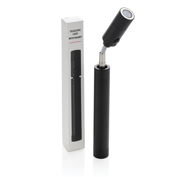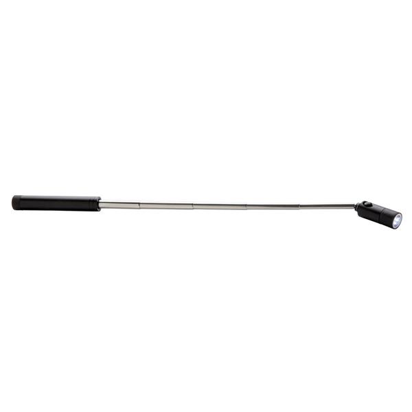 Latarka teleskopowa 3 LED z magnesem, regulowana długość od 17 cm do 58 cm, wykonana z aluminium, regulowana górna część ze światłem umożliwiająca świecenie w dowolnym kierunku, magnes może służyć do przyczepienia do metalowej powierzchni lub do wyciągnięcia metalowych elementów z trudno dostępnych miejsc, baterie w komplecie, ślad węglowy produktu: 2,4 kg CO2