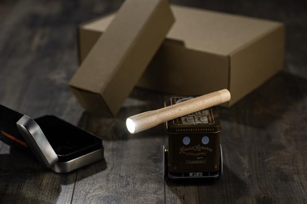 Latarka TIMBERA wykonana jest z drewna bukowego i wyposażona w źródło światła o mocy 5 W. Zasilana trzema bateriami AAA (niedołączonymi do zestawu) sprawdza się w codziennym użytkowaniu w domu, w pracy czy w plenerze. Drewniana obudowa nadaje jej solidny charakter i stanowi dobre tło pod znakowanie logo. Prosta forma oraz wygodny rozmiar czynią z niej praktyczny gadżet reklamowy, który będzie zawsze pod ręką.