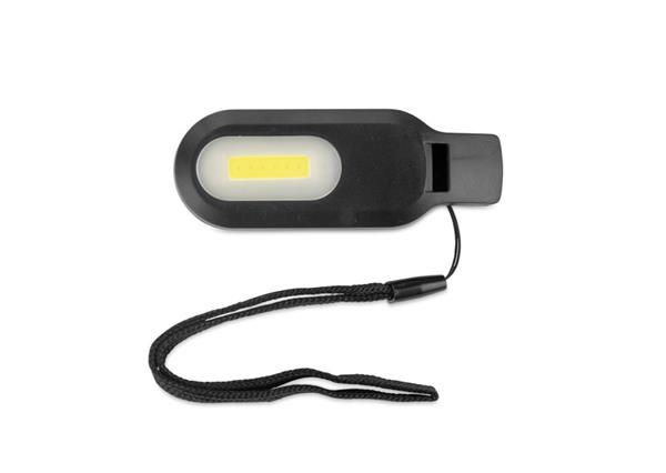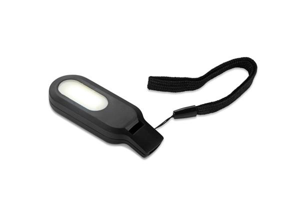 Latarka WISLI to praktyczne akcesorium 2 w 1 – połączenie lampki i gwizdka, które sprawdzi się podczas spacerów, podróży czy aktywności na świeżym powietrzu. Wyposażona w dwa tryby świecenia – ciągły i pulsujący – zapewnia dodatkowe źródło światła oraz możliwość sygnalizacji. Zasilana jest trzema wymiennymi bateriami AAA (brak w zestawie), co pozwala łatwo przygotować ją do pracy. Dzięki lekkiej konstrukcji i dołączonej czarnej smyczy można mieć ją zawsze pod ręką. To gadżet reklamowy, który zyskuje indywidualny charakter dzięki opcji znakowania logo.