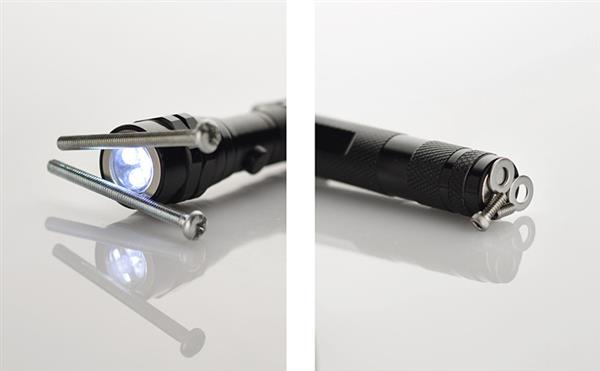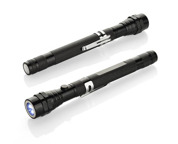 Niesamowity gadżet o licznych zastosowaniach. Wykonana w całości z metalu latarka posiada rozsuwany, teleskopowy korpus oraz ruchomą główkę z 3 diodami LED. Dodatkowym atutem są magnesy umieszczone na obydwu końcach latarki. Konstrukcja jest bardzo solidna i wyposażona w metalowy klip do zawieszenia. Znakowanie możliwie na specjalnie przygotowanej płaskiej powierzchni na rękojeści.