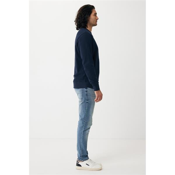 Lekki sweter, unisex, regularny krój, okrągły dekolt, długie rękawy, wykonana w 30% z bawełny z recyklingu i w 70% z bawełny organicznej o gramaturze 280 g/m2, posiada wbudowany znacznik AWARE™, który potwierdza wykorzystanie materiałów z recyklingu, posiada kod QR na metce, który prowadzi do cyfrowego paszportu produktu, 2% wpływów z każdego sprzedanego produktu z kolekcji Impact jest przekazywane na rzecz Water.org, ślad węglowy produktu: 7,04 kg CO2