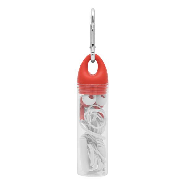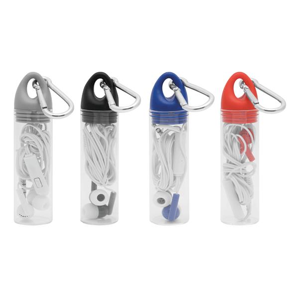 Słuchawki douszne LISTEN & TALK ze zintegrowanym mikrofonem i przyciskiem do odbierania połączeń, 3,5 mm wtyczka jack, długość przewodu ok. 120 cm, w plastikowej obudowie z dopasowanym, kolorowym zamknięciem i aluminiowym karabińczykiem.