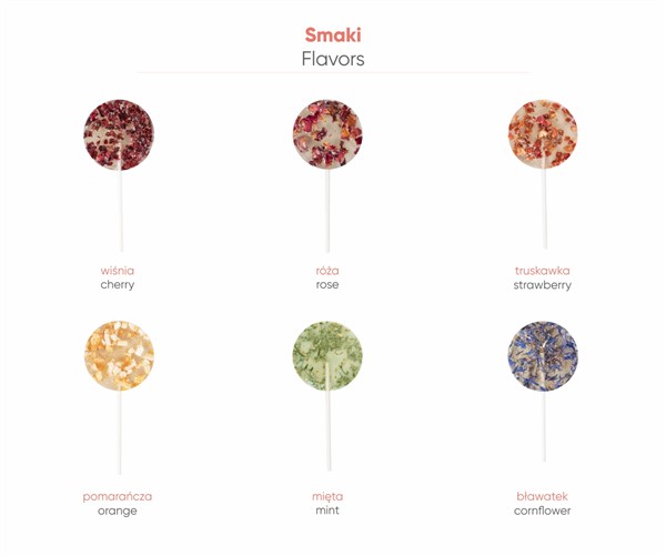 Dostępne smaki drobinek to: truskawka, pomarańcza, wiśnia, róża, bławatek oraz mięta. Dzięki nowoczesnemu wyglądowi i intensywnemu owocowemu smakowi, ten produkt zachwyca swoją lekkością, przypominając radosną wiosenną aurę.