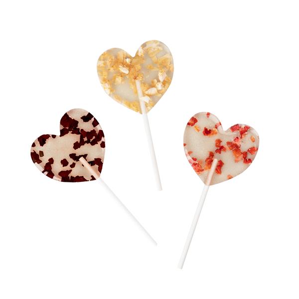 LIZAK OWOCOWY KRISTAL SERCE PLUS to romantyczny, transparentny lizak bez cukru, udekorowany drobinkami naturalnych składników, które zatopione są w jego wnętrzu.