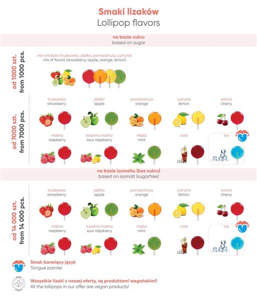 Polecamy też soczyście owocowy wariant – lizaki z dodatkiem soków owocowych. Dostępne są w 4 wersjach smakowych: jabłko, truskawka, pomarańcza i cytryna. Ich kolor i smak to zasługa naturalnych soków owocowych.