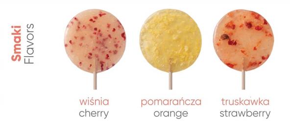 Polecamy też soczyście owocowy wariant – lizaki z dodatkiem soków owocowych. Dostępne są w 4 wersjach smakowych: jabłko, truskawka, pomarańcza i cytryna. Ich kolor i smak to zasługa naturalnych soków owocowych.