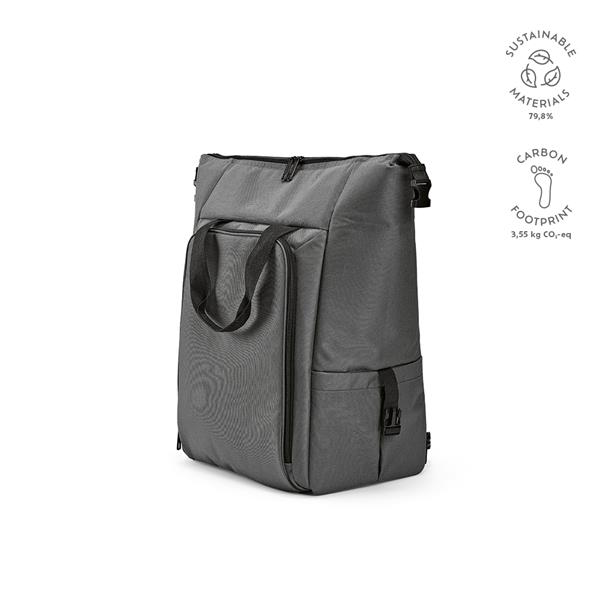 Wzbogać swoje doświadczenie dzięki naszemu wszechstronnemu plecakowi chłodzącemu o pojemności 28 litrów. Wykonany z rPET, z dużą kieszenią przednią i dwiema kieszeniami bocznymi. Duża komora gwarantuje dużą pojemność. Przechowuj napoje w chłodzie i ciesz się łatwym czyszczeniem.