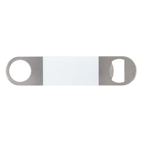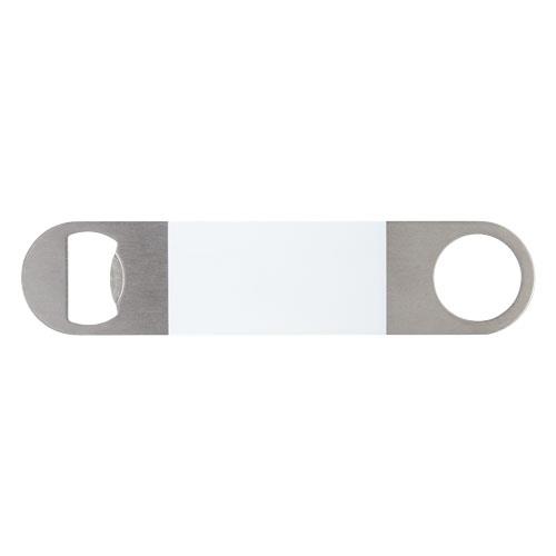 Otwieracz do butelek wykonany ze stali nierdzewnej z dużą kolorową powierzchnią na środku.