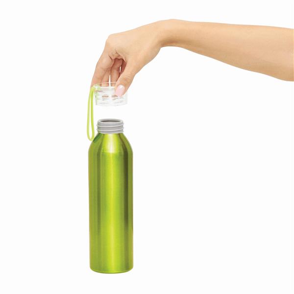 Aluminiowa butelka LOOPED z przezroczystą, plastikową zakrętką z silikonową pętelką. Pojemność ok. 650 ml.