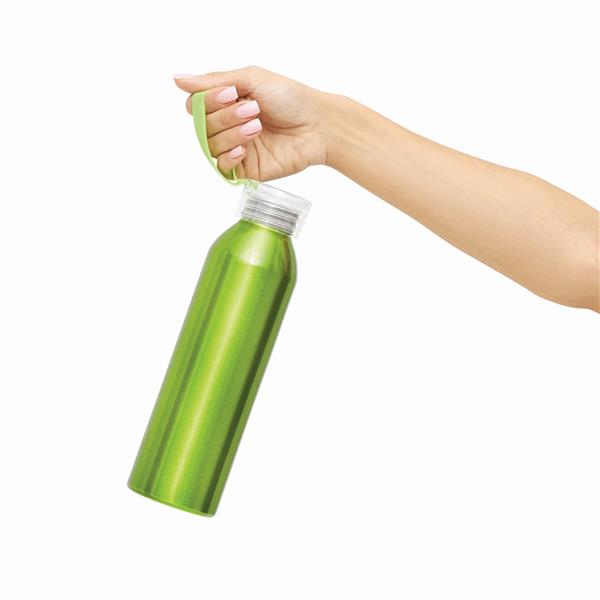 Aluminiowa butelka LOOPED z przezroczystą, plastikową zakrętką z silikonową pętelką. Pojemność ok. 650 ml. Materiał: Aluminium/Plastik/Silikon Kolor: zielone jabłko Tagi: Butelki do napojów,artykuły sportowe,fitness,artykuły rekreacyjne,akcesoria podróżne