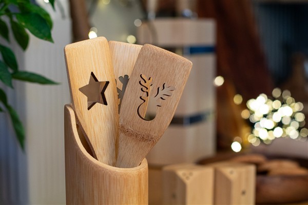 Bambusowa łopatka z wyciętym wzorem choinki.