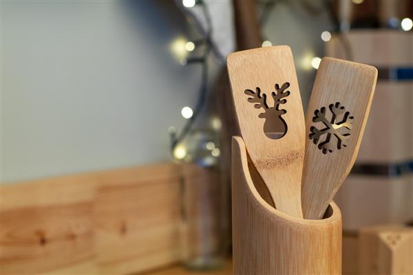 Bambusowa łopatka z wyciętym wzorem choinki.