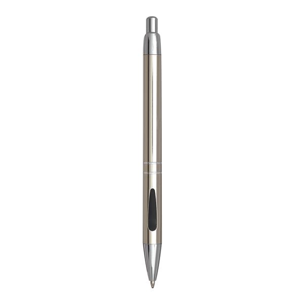 Aluminiowy długopis LUCERNE z lśniącą obsadką i częściowo pokrytym gumą uchwytem, mechanizm przyciskowy i duży wkład z czarnym tuszem.