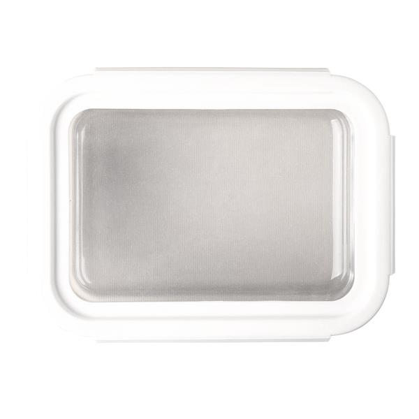 Szklany pojemnik na lunch (900 ml) z hermetyczną pokrywką z silikonu. Elastyczna pokrywka pozwala dopasować się do zawartości pojemnika zwiększając jego objętość. Można używać w mikrofalówce, piekarniku, zamrażarce oraz myć w zmywarce. Zakres temperatur dla szkła: -40 ~400 ?. Zakres temperatur dla pokrywki: -20 ~120 ?