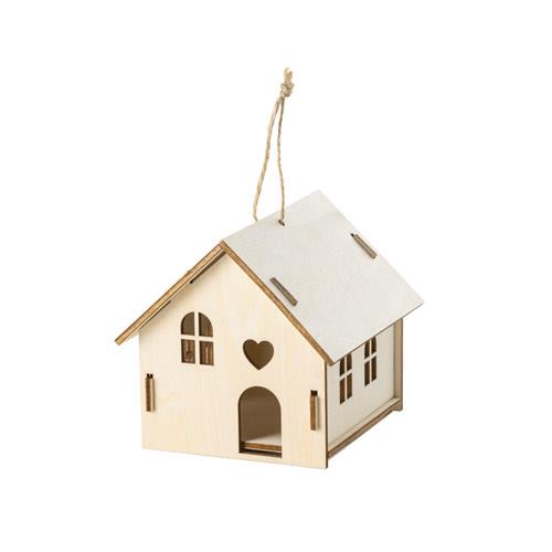 Ozdobny domek ze sklejki ze sznurkiem do zawieszenia na choince. Może służyć jako pudełko upominkowe. Sprzedawane zdemontowane. 93 x 114 x 119 mm