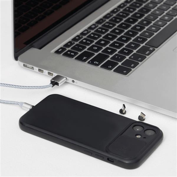 Kabel ładujący MAG POWER do ładowania urządzeń elektronicznych. Posiada 3 przejściówki (USB Type-C, Micro-USB i Lightning®). Długość ok. 100 cm. Przejściówki wpinane są bezpośrednio do urządzenia, które należy naładować. Połączone są z kablem za pomocą złącza magnetycznego.