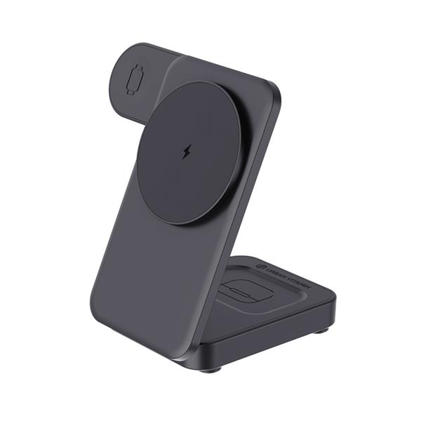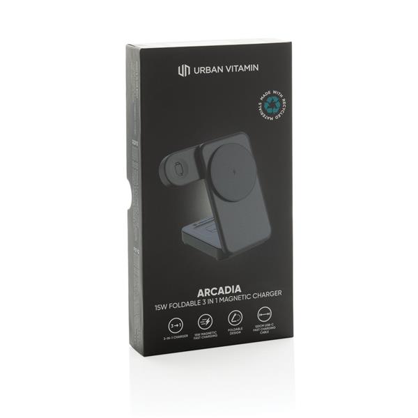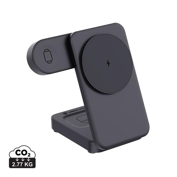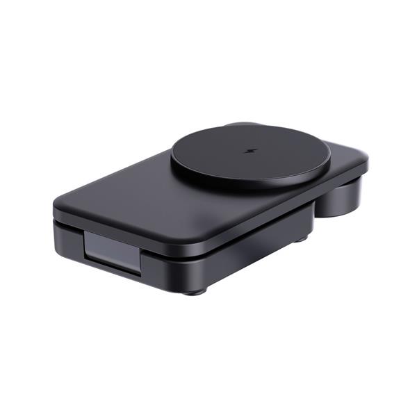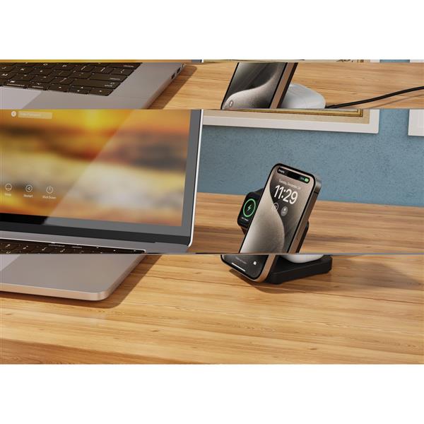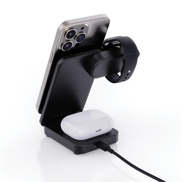 Magnetyczna ładowarka bezprzewodowa 15W 3 w 1, ładowarka bezprzewodowa 15W do telefonu, ładowarka bezprzewodowa 5W do słuchawek, ładowarka bezprzewodowa 2,5W do ładowania smartwatchy (kompatybilne wyłączenie z urządzeniami iOS), wskaźnik ładowania, 15 wbudowanych magnesów, działa z telefonami posiadającymi możliwość ładowania indukcyjnego, wejście USB-C 9V/2.2A, kabel 120 cm USB-C do USB-C w komplecie, wykonana z ABS z recyklingu, całkowita zawartość materiałów z recyklingu obliczona na podstawie wagi całkowitej przedmiotu: 34%