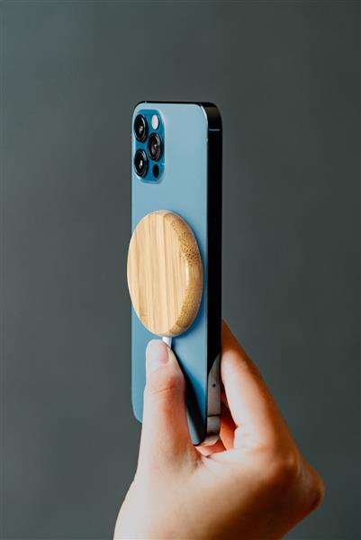Magnetyczna, szybka ładowarka indukcyjna (10W) w bambusowej obudowie ze wskaźnikiem LED ładowania. W zestawie samoprzylepny metalowy pierścień do korzystania z funkcji magnetycznej na dowolnym urządzeniu ładowanym bezprzewodowo. W zestawie kabel USB.