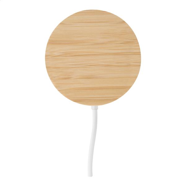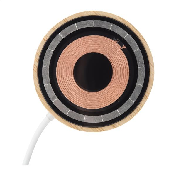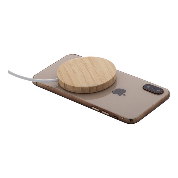 Magnetyczna szybka ładowarka bezprzewodowa (15W) w bambusowej i przezroczystej obudowie z tworzywa sztucznego z widocznymi elementami elektronicznymi. Zawiera samoprzylepny metalowy pierścień umożliwiający wykorzystanie funkcji magnetycznej na dowolnym urządzeniu ładowanym bezprzewodowo. Kompatybilny z iPhonem® 12 lub nowszym. W zestawie kabel do ładowania USB-C.