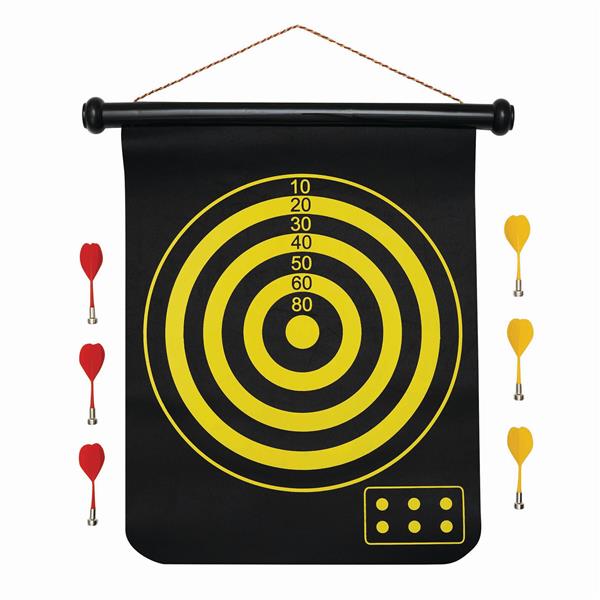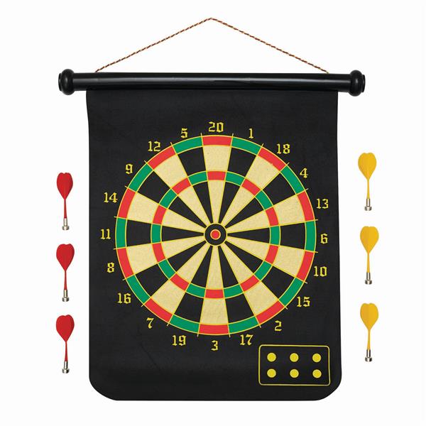 Magnetyczna tablica do rzutek RAYMOND. Z wytrzymałej tkaniny umożliwiającej zwijanie. Tablica dwustronna z tradycyjną tarczą do rzutek z jednej strony i z normalną tarczą z drugiej strony. Zestaw z 6 rzutkami magnetycznymi. W pudełku prezentowym.