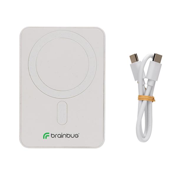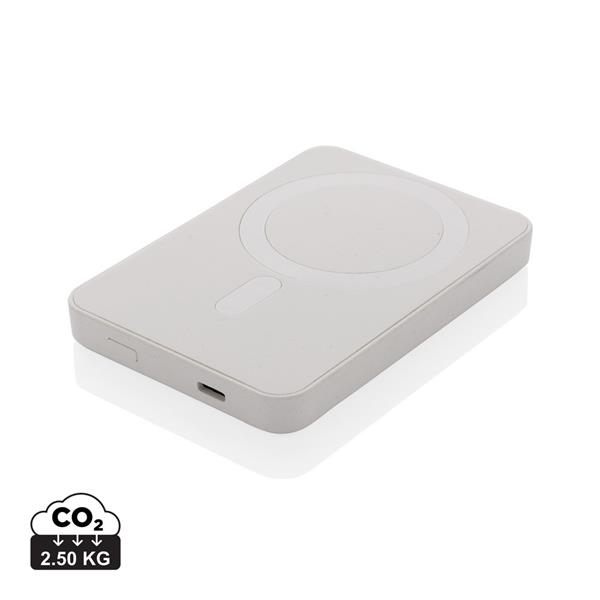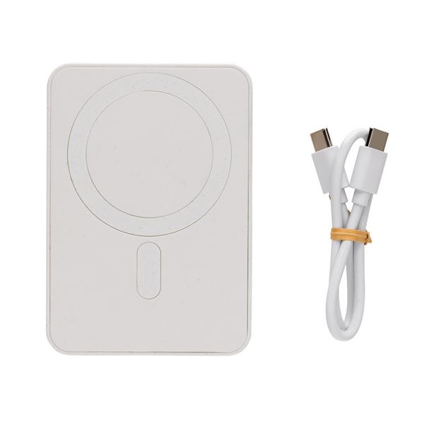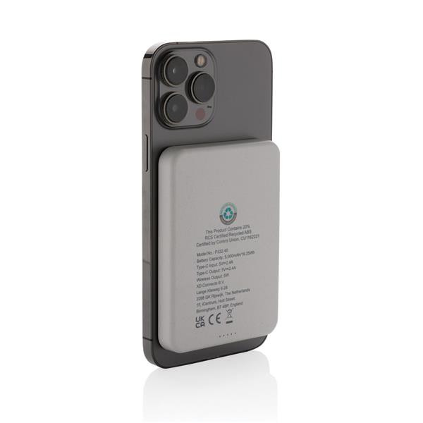 Power bank 5000 mAh, magnetyczna ładowarka bezprzewodowa 5W, wskaźniki poziomu naładowania, wykonany z ABS z recyklingu, całkowita zawartość materiałów z recyklingu obliczona na podstawie wagi całkowitej przedmiotu: 20%, wejście USB typu C 5V/2.4A, wyjście USB typu C 5V/2.4A, kabel w komplecie