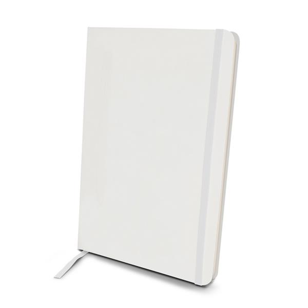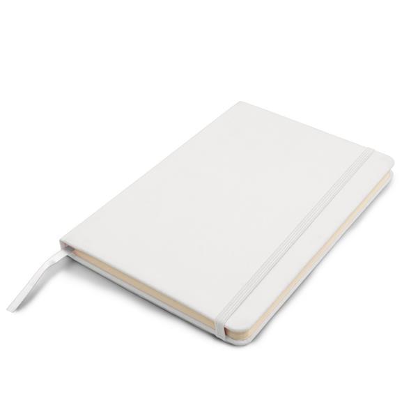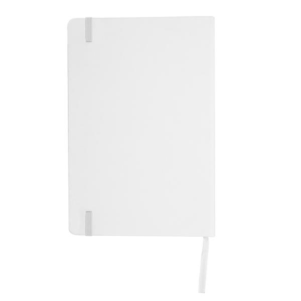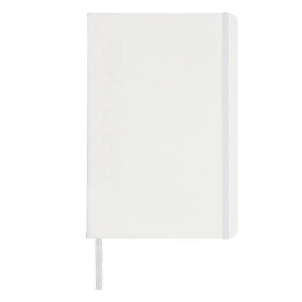 Notatnik A5 (80 kartek w linie), twarda okładka z PU z wbudowanym magnesem umożliwiającym przyczepienie przyborów do pisania (nie dołączone), tasiemka zakładkowa i elastyczna opaska do zamykania