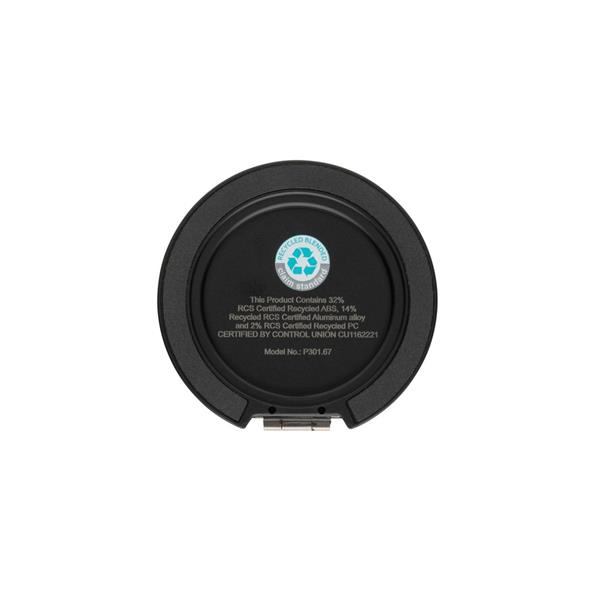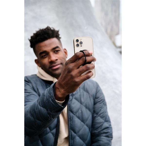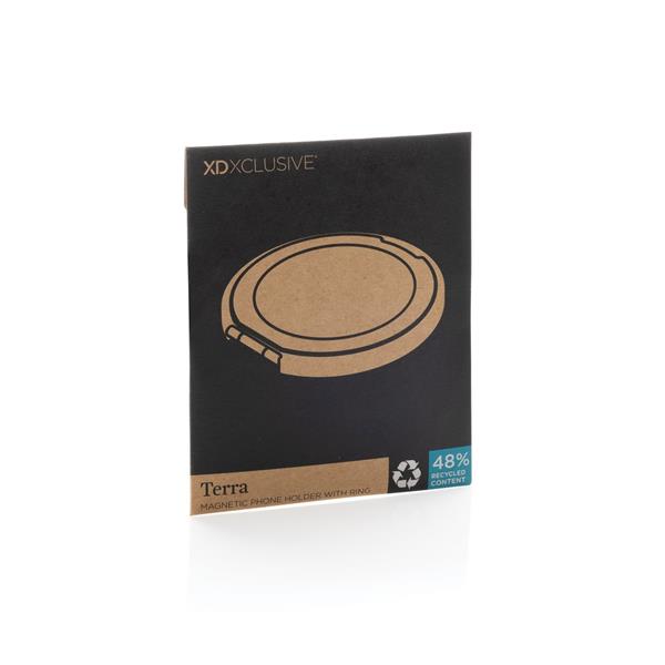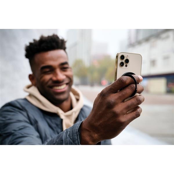 Magnetyczny uchwyt do telefonu Terra, wykonany z recyklingowanego plastiku RCS i aluminium, kompatybilny z telefonami z wbudowanym magnesem (iPhone 12 i nowsze) oraz urządzeniami Android z obsługą QI2, dla pozostałych telefonów wymaga etui magnetycznego, aluminiowy pierścień do ustawienia telefonu w pozycji pionowej lub poziomej, funkcja uchwytu do trzymania