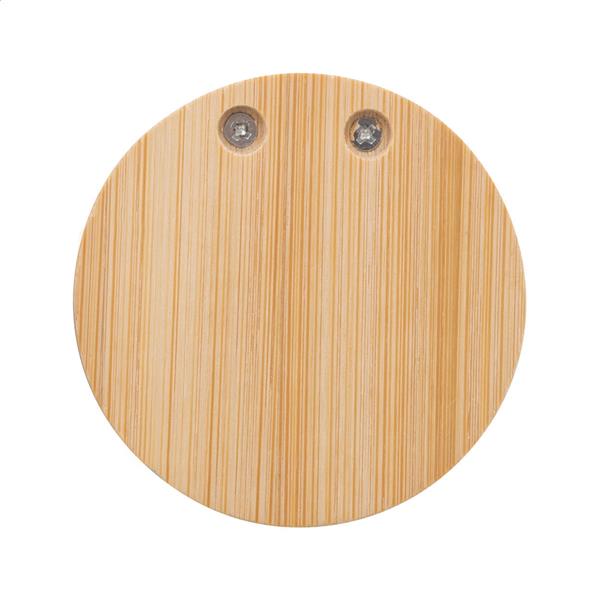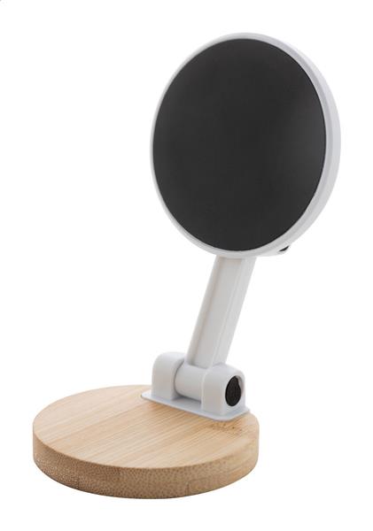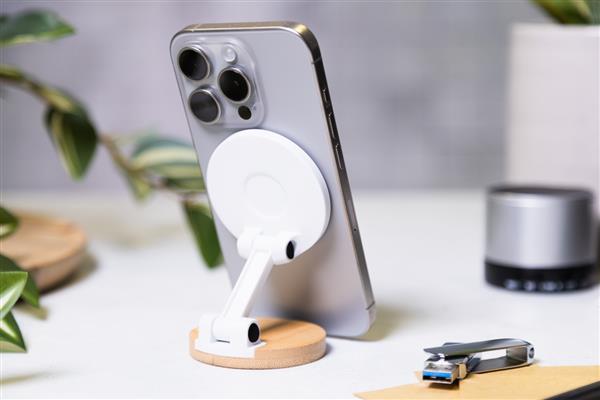 Magnetyczny, biurkowy uchwyt na telefon komórkowyz bambusa i ABS z recyklingu. Zawiera samoprzylepny metalowy pierścień do korzystania z funkcji magnetycznej na dowolnym urządzeniu. Kompatybilny z iPhone® 12 lub nowszym.