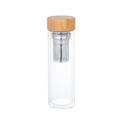 Próżniowy kubek podróżny z podwójną ścianką z borokrzemianowego szkła z bambusową pokrywką. W zestawie 2 sitka ze stali nierdzewnej. Pojemność butelki wynosi do 490 mL. Po zdjęciu pokrywki nadaje się do mycia w zmywarce. Dostarczany w pudełku upominkowym z papieru kraft. Ponieważ produkt jest wykonany z naturalnych materiałów, kolor produktu oraz wynik drukowania mogą się różnić w zależności od produktu. o72 x 234 mm
