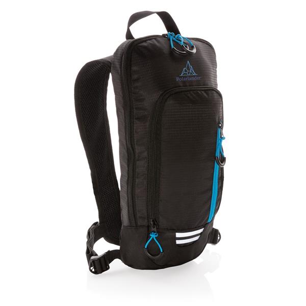 Mały plecak turystyczny, pojemność 7l, wykonany z wytrzymałej tkaniny poliestrowej, doskonale nadaje się do aktywności na świeżym powietrzu, wewnątrz kieszeń na butelkę, plecak posiada otwór do wyprowadzenia rurki nawadniającej, przednia kieszeń na zamek błyskawiczny, zintegrowana osłona przeciwdeszczowa, miękkie, regulowane paski na ramię, nie zawiera PVC, ślad węglowy produktu: 2,11 kg CO2