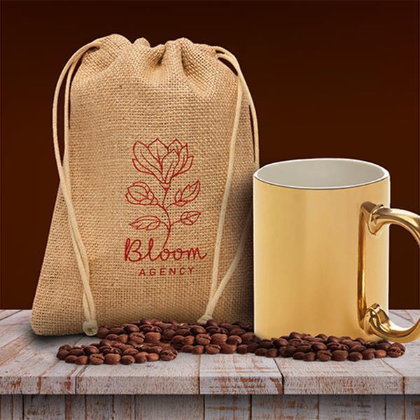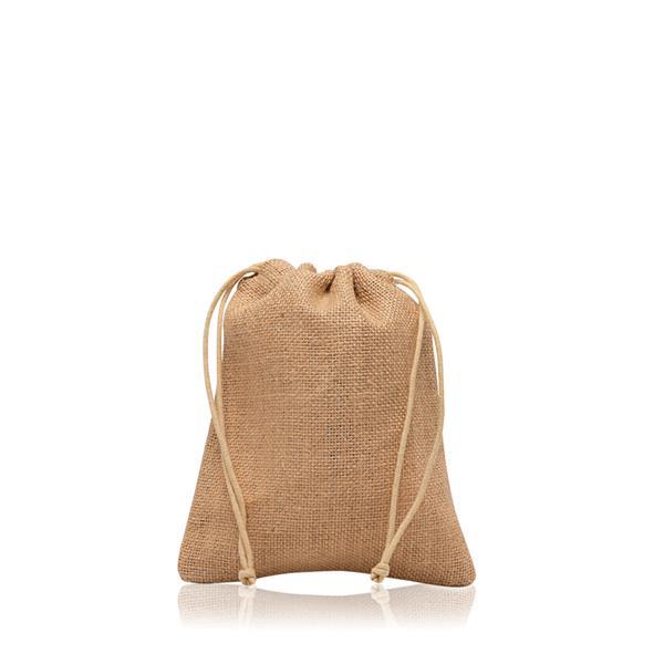 Mały ekologiczny worek z juty, zamykany na sznurki.