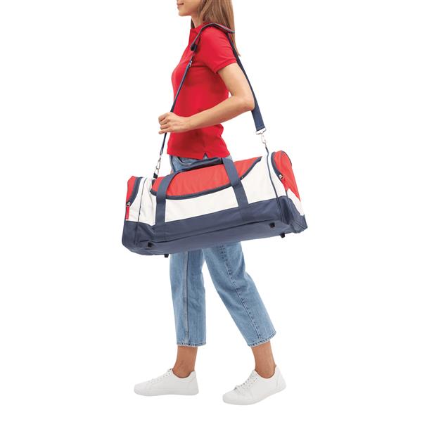 Torba sportowa MARINA GYM z komorą główną i dwiema bocznymi kieszeniami zapinanymi na zamek, wzmocnionymi uchwytami do przenoszenia, regulowanym i odpinanym paskiem na ramię. Materiał: 600D Poliester Kolor: biały, czerwony, niebieski Tagi: Torby sportowe,torby,bagaż,artykuły sportowe,fitness