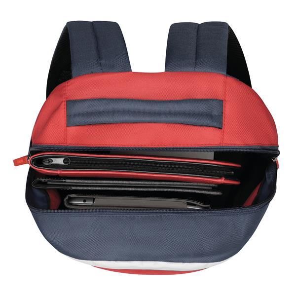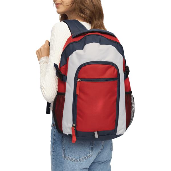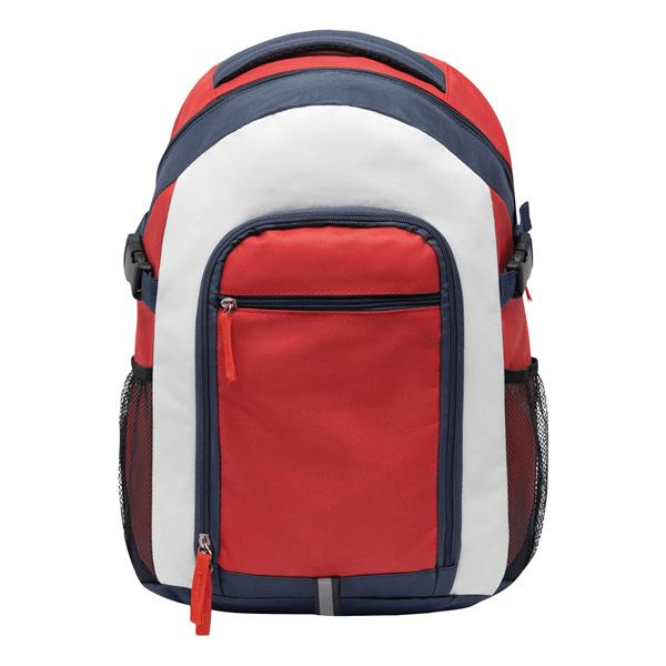 Plecak MARINA, z komorą główną, kieszenią przednią oraz kieszonkami dodatkowymi zapinanymi na zamek, dwiema bocznymi kieszeniami z siatki, bocznymi paskami zaciskowymi, wzmocnionym uchwytem, wyściełane szelki oraz tył plecaka. Materiał: 600D Poliester Kolor: biały, czerwony, niebieski Tagi: Plecaki,torby,bagaż