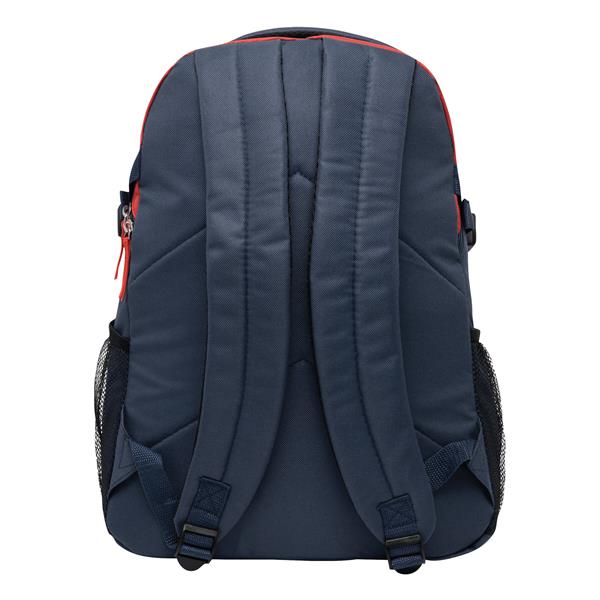 Plecak MARINA, z komorą główną, kieszenią przednią oraz kieszonkami dodatkowymi zapinanymi na zamek, dwiema bocznymi kieszeniami z siatki, bocznymi paskami zaciskowymi, wzmocnionym uchwytem, wyściełane szelki oraz tył plecaka.