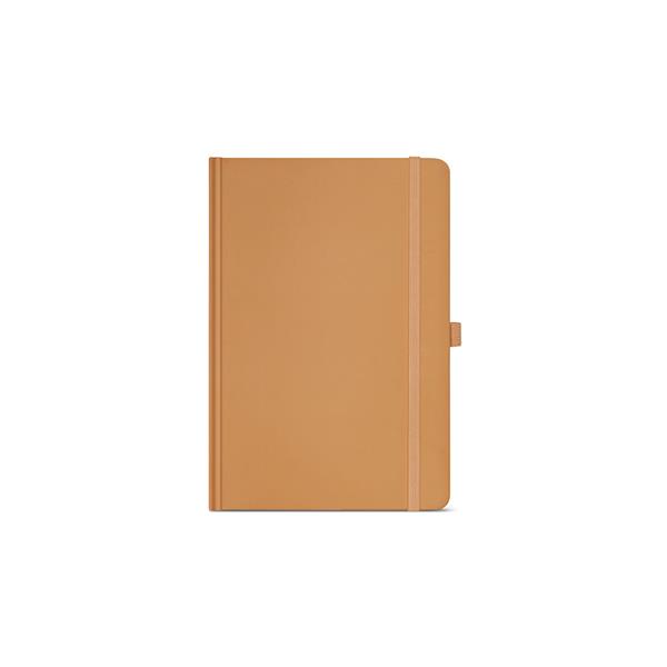 Nasz notatnik A5 ma okładkę z papieru pochodzącego z recyklingu i 196 stron w linie z kości słoniowej 70 gsm. Posiada wytrzymałą twardą okładkę, zaokrąglone rogi i wstążkową zakładkę. Posiada również elastyczne zamknięcie, rozszerzalną kieszeń i uchwyt na długopis.