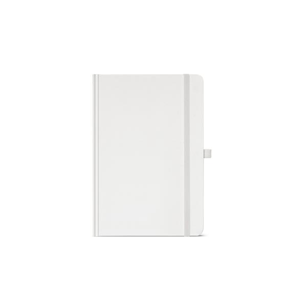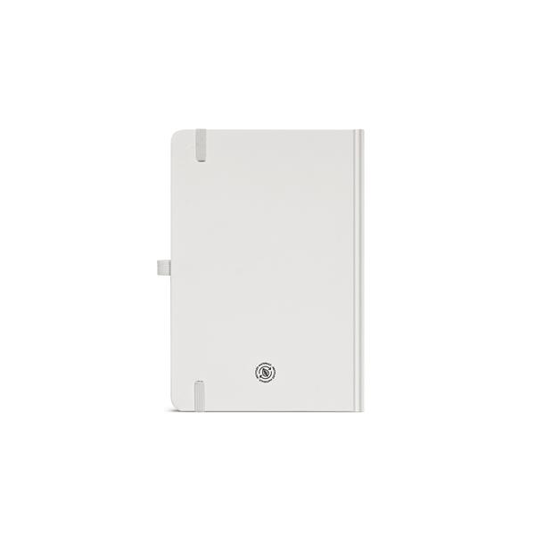 Nasz notatnik A5 ma okładkę z papieru pochodzącego z recyklingu i 196 stron w linie z kości słoniowej 70 gsm. Posiada wytrzymałą twardą okładkę, zaokrąglone rogi i wstążkową zakładkę. Posiada również elastyczne zamknięcie, rozszerzalną kieszeń i uchwyt na długopis.