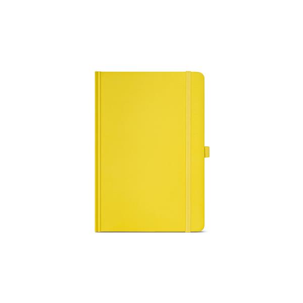 Nasz notatnik A5 ma okładkę z papieru pochodzącego z recyklingu i 196 stron w linie z kości słoniowej 70 gsm. Posiada wytrzymałą twardą okładkę, zaokrąglone rogi i wstążkową zakładkę. Posiada również elastyczne zamknięcie, rozszerzalną kieszeń i uchwyt na długopis.