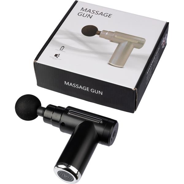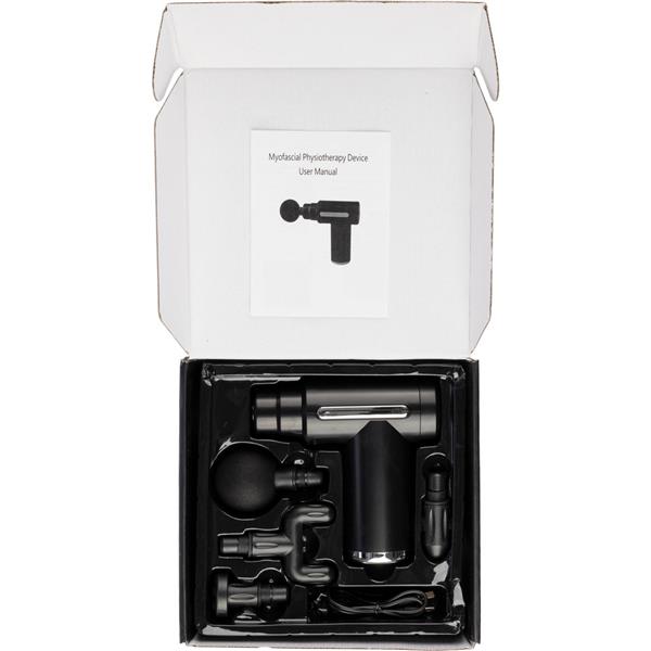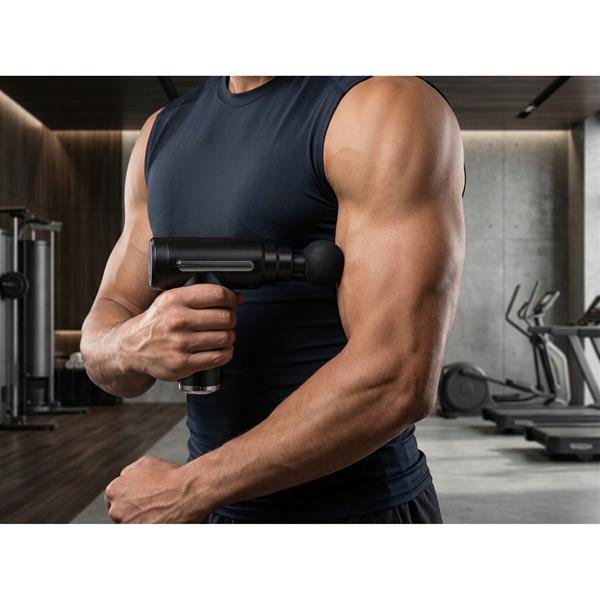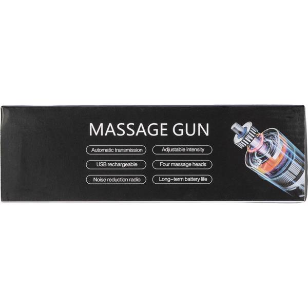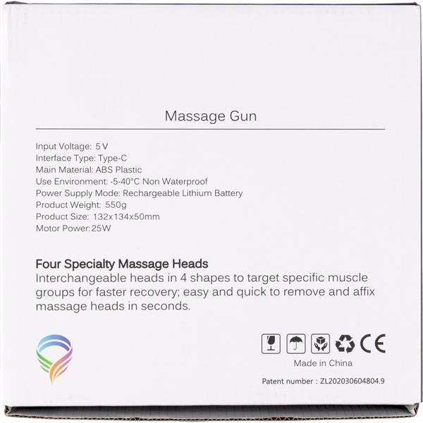 Masażer mięśni z silnikiem szczotkowym (prędkość 1800 – 3200 obr/min) i akumulatorem 1200 mAh, wejście 5V, 6 poziomów intensywności masażu mięśni, pomaga zrelaksować się po stresującym dniu, zawiera 4 końcówki masujące, pudełko podarunkowe w komplecie, produkt wykonany z ABS