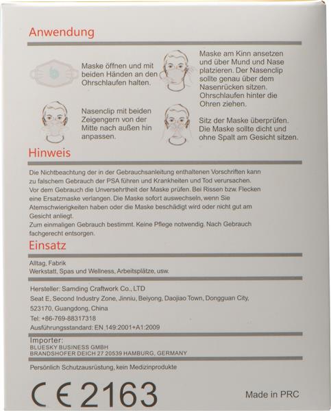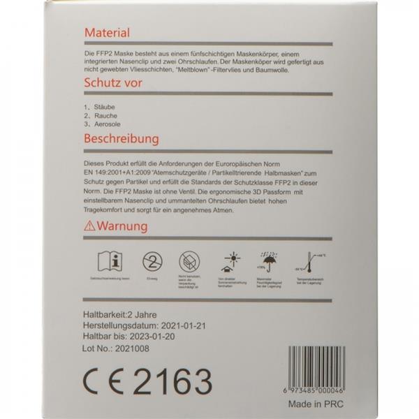 Maska ochronna 5-warstwowa, posiada dwie gumowe pętle na uszy i zintegrowany klips na nos, który pozwala lepiej dopasować ją do kształtu twarzy. Wykonana z włókniny, polaru „meltblown” oraz bawełny. Maska FFP2 zgodna z normą EN149:2001 + A1:2009.