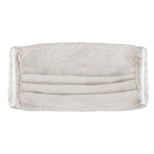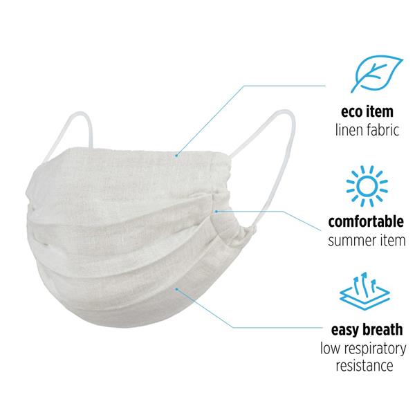 Maseczka wielokrotnego użytku, niemedyczna, dwuwarstwowa, wykonana z lnu, temperatura pierwszego prania: 30 stopni Celsjusza, temperatura kolejnych prań: 40 stopni Celsjusza, maseczkę można poddawać sterylizacji wodnej w temperaturze 100 stopni Celsjusza oraz prasować w temperaturze do 200 stopni Celsjusza, posiada certyfikat OEKO-TEX Standard 100, elastyczne mocowania zapewniające komfort noszenia (wyprodukowana w Europie / made in Europe)
