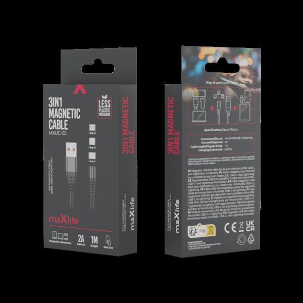 Kabel magnetyczny Maxlife jest innowacyjną i wygodną alternatywą dla klasycznych kabli, który wkładane są do interfejsu. Mocowanie za pomocą magnesów umożliwia przyciąganie z optymalną siłą. Gwarantuje to stabilne połączenie bez zakłóceń. Kabel jest wyposażony w trzy różne końcówki, do trzech najpopularniejszych wejść: Micro USB, USB Typ C oraz Lightning. Jest bezpieczny i wytrzymały, a dodatkowo chroni port ładowania.