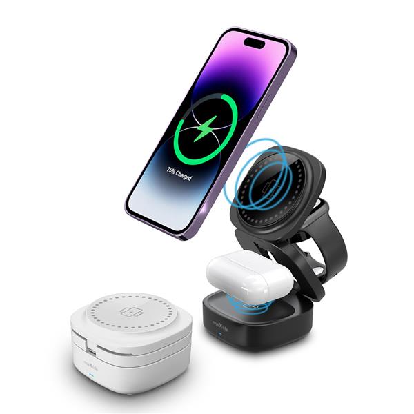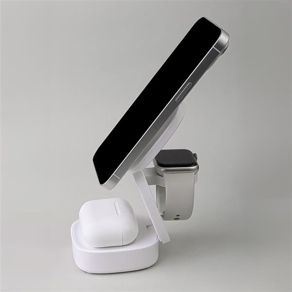 Mocne magnesy gwarantują stabilne połączenie z urządzeniami, umożliwiając jednoczesne ładowanie trzech różnych urządzeń, w tym telefonu, słuchawek oraz zegarka bezprzewodowo.