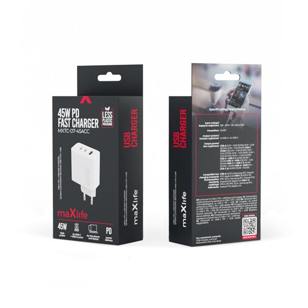 Ładowarka sieciowa PD QC MXTC-07 zapewnia jednoczesne i efektywne ładowanie trzech urządzeń. Dzięki mocy wynoszącej 45 W oraz obsłudze różnych protokołów szybkiego ładowania, takich jak Power Delivery i Quick Charge, ta ładowarka stanowi doskonałe wsparcie dla współczesnych urządzeń mobilnych. Bez względu na to, czy użytkownik korzysta ze smartfona czy laptopa, z pewnością doceni jej szybkie i bezpieczne ładowanie.