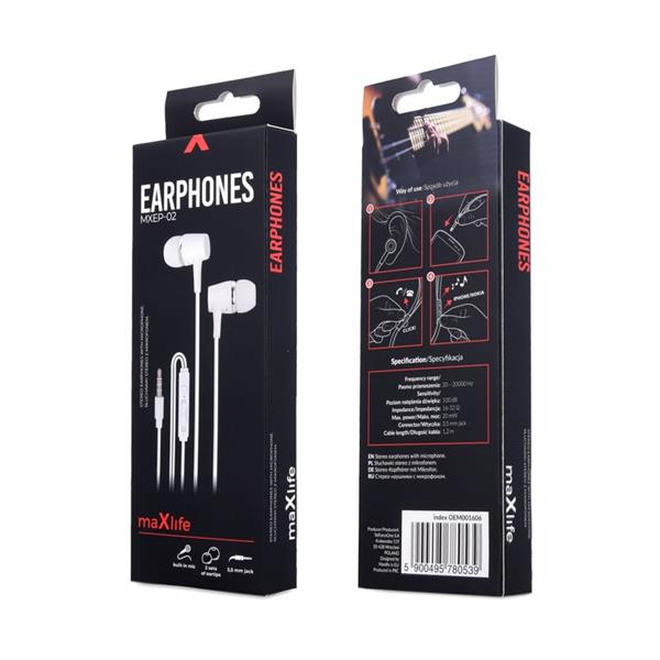 Przewodowe słuchawki Maxlife. Zabierz swoją ulubioną muzykę w każdą podróż. Wygodne, douszne gumki zapewnią idealne dopasowanie i wygodę podczas użytkowania, kabel długości 1,2 m pozwoli na pełną swobodę, a kontroler z wbudowanym głośnikiem pozowoli na rozmowy przez telefon podczas, gdy Twoje ręcę będą zajęte.