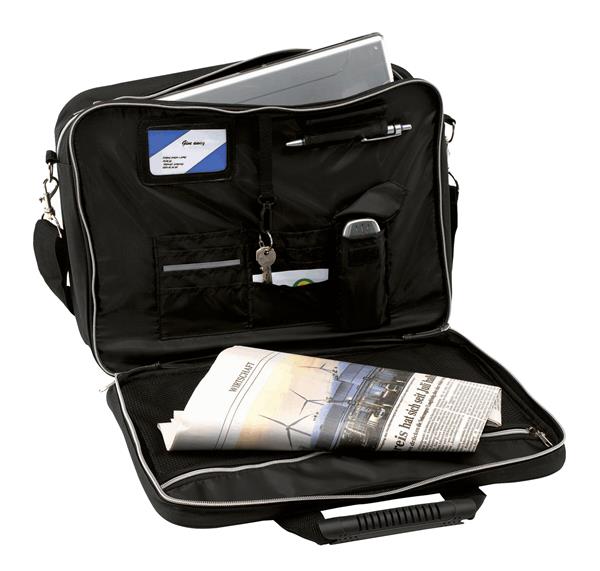 Torba reporterska MEETING z główną komorą zapinaną na zamek i miękką kieszenią na laptop, druga duża kieszeń z funkcją organizera, 1 zewnętrzna kieszeń na drobiazgi zapinana na rzep oraz przezroczysta kieszonka na wizytówki.
