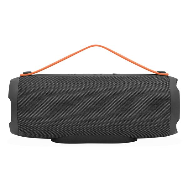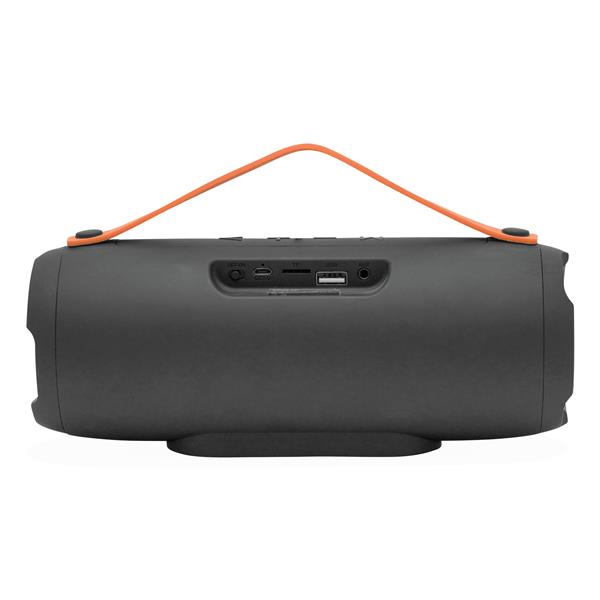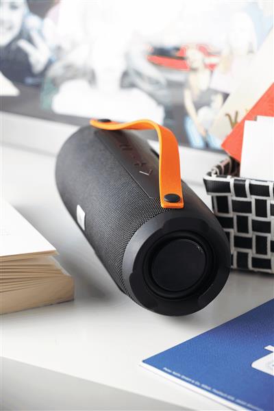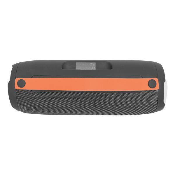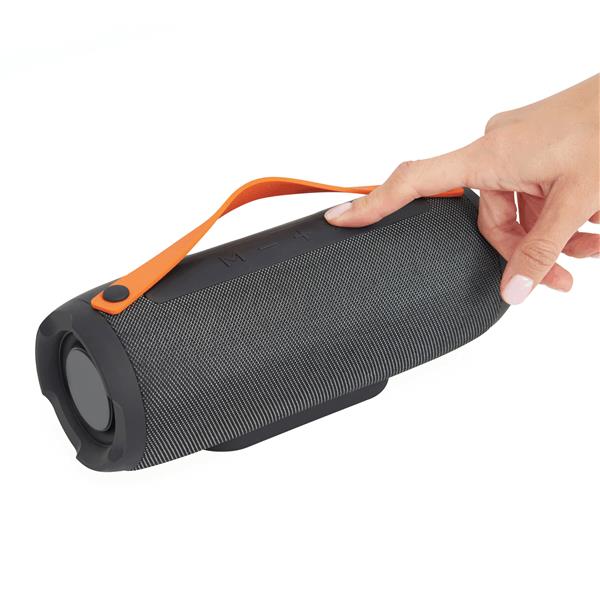 Głośnik bezprzewodowy MEGA BOOM o mocy wyjściowej muzyki 2 x 5 W. Do parowania z telefonem komórkowym lub tabletem. Można podłączyć do urządzeń zewnętrznych poprzez złącze AUX-IN. MP3 można odtwarzać za pomocą karty USB lub Micro-SD. Funkcja głośnomówiąca, funkcja radia FM, wydajny akumulator o pojemności ok. 1200 mAh. Czas pracy ok. 2-3 godz., czas ładowania ok. 2 godz., maks. zasięg ok. 10 m. Zawiera kabel ładujący USB ze złączem Micro-USB o długości ok. 34,5 cm i kabel audio o długości ok. 51 cm. Mała tabliczka do grawerowania. Pomarańczowy silikonowy uchwyt.