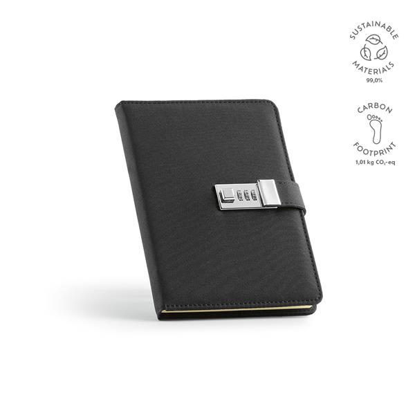 Chroń swoje pomysły dzięki naszej zamykanej okładce na notatnik A5 300D rPET. Posiada on wyjmowany notatnik ze 192 stronami FSC z gładkiego papieru o gramaturze 70 g/m2 w kolorze kości słoniowej. Zawiera dwie wewnętrzne kieszenie, które ułatwiają organizację. Zwiększ swoje doświadczenie pisania w odpowiedzialny sposób.