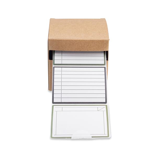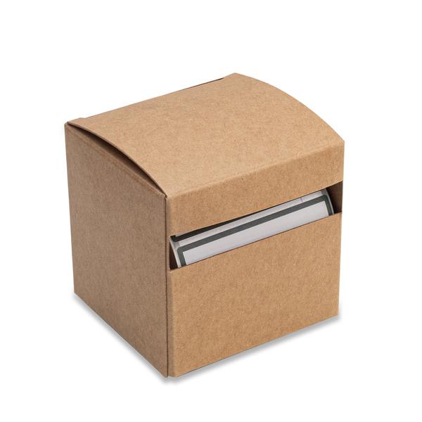 Praktyczny zestaw karteczek samoprzylepnych zawierający 250 arkuszy w rozmiarze 70 × 55 mm. Całość zapakowana w pudełko z papieru kraftowego. Memo naklejki wysuwane są przez otwór w pudełku. Przydatne zarówno w domu jak i burze.