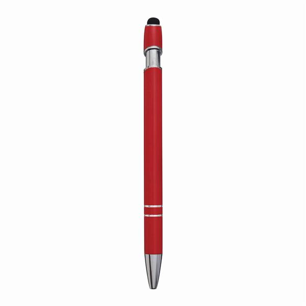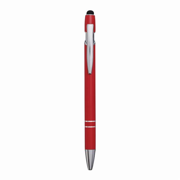 Aluminiowy długopis MERCHANT: z błyszczącą metalową obudową, mechanizmem na przycisk, gumowaną końcówką do ekranów dotykowych, niebieskim wkładem. Materiał: Aluminium/Silikon Kolor: czerwony Tagi: Pióra kulkowe,ołówki,akcesoria biurowe,przybory do pisania